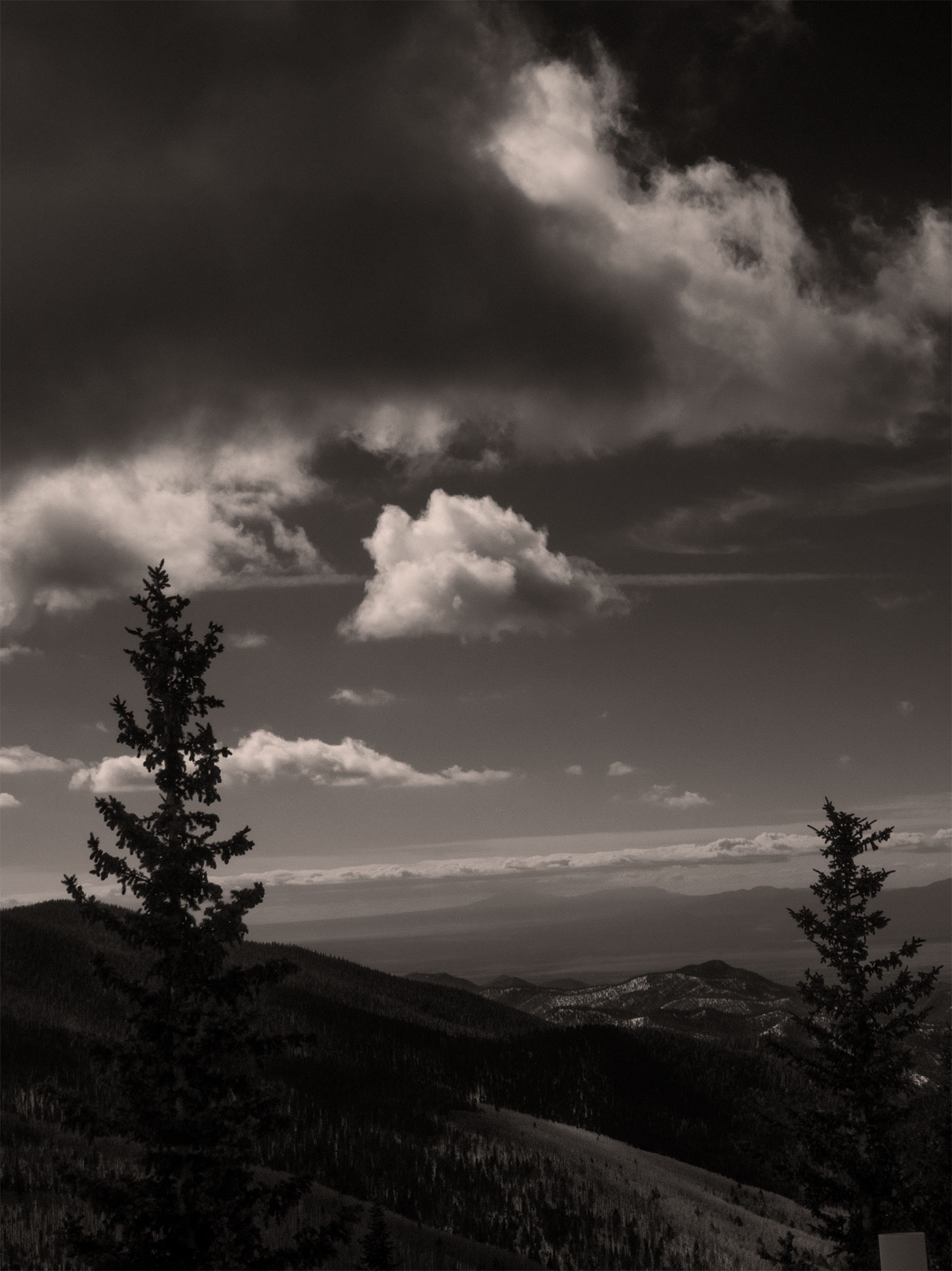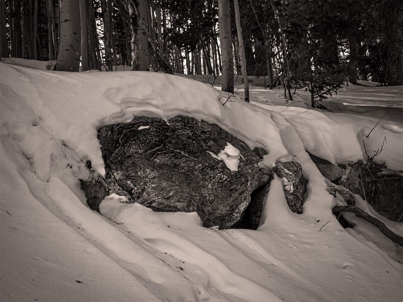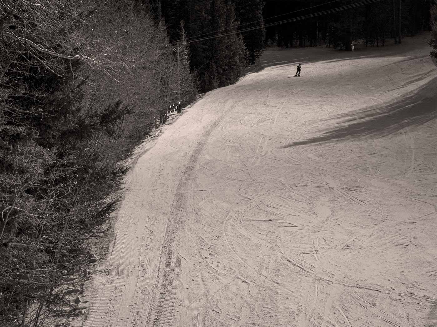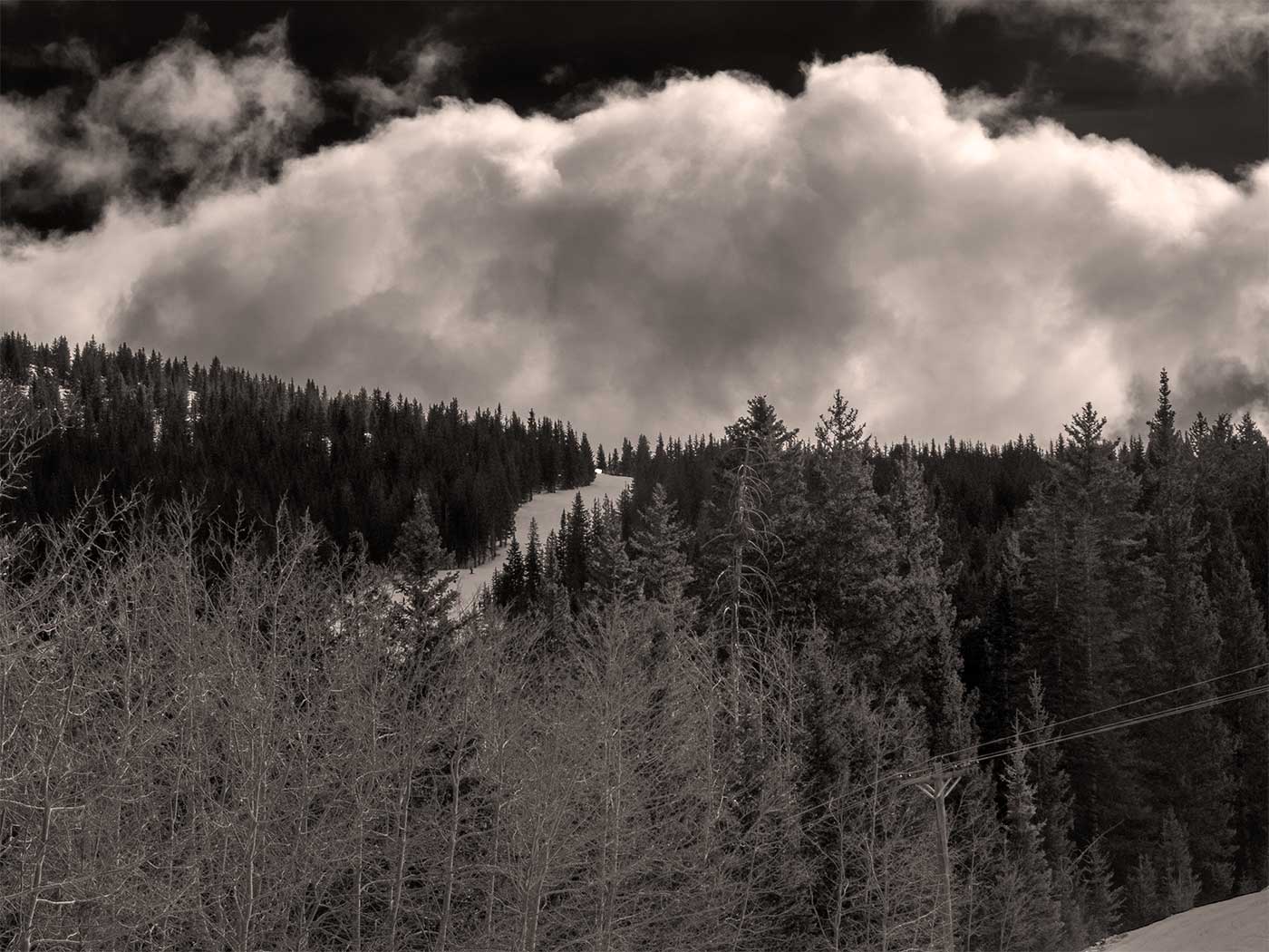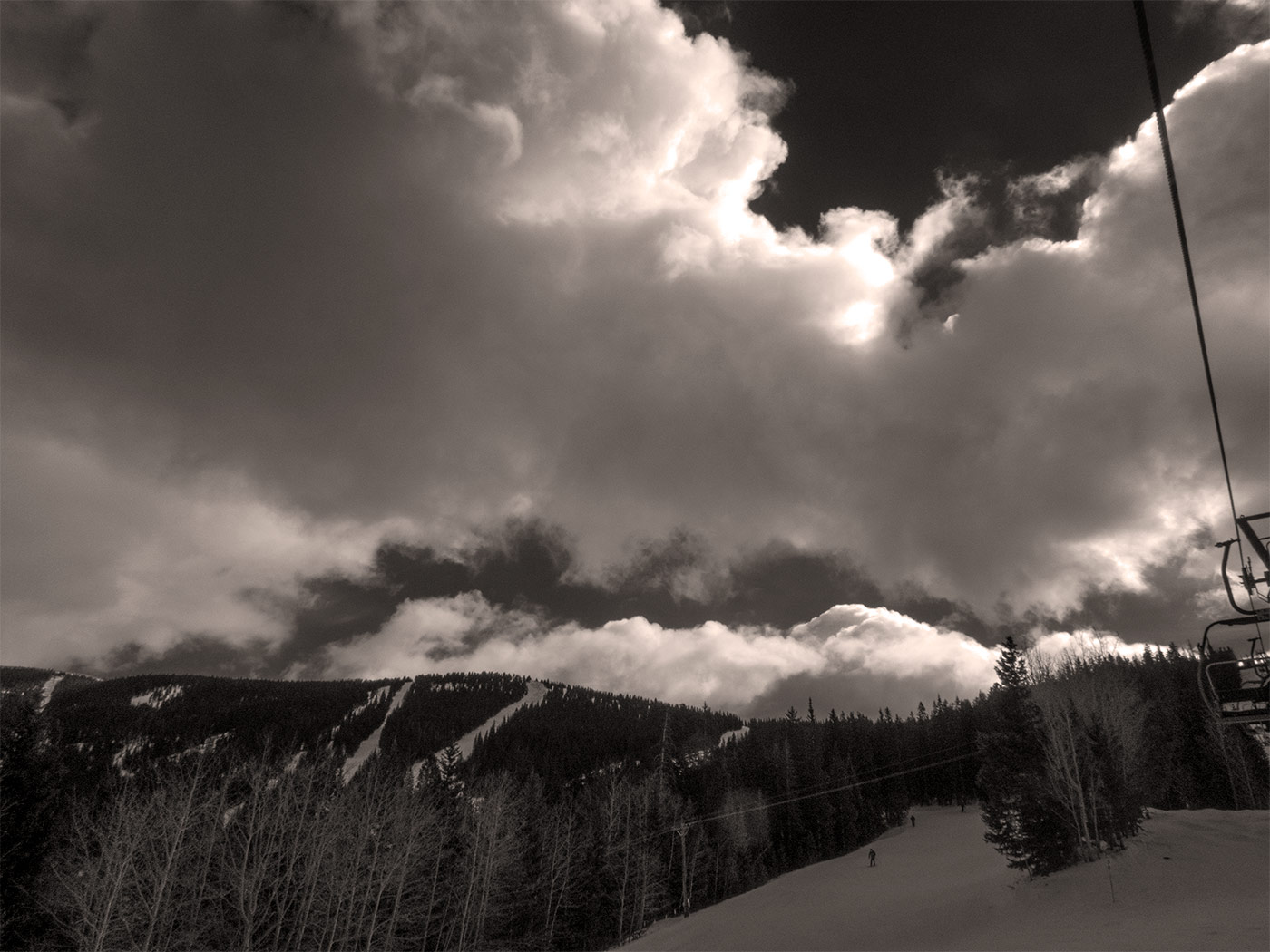 Today was bleak, very dark and moody up there, as my title suggests. We are skiing at 12,000 feet and mountain weather can change VERY quickly and dramatically. I always have the tiny Sony HX-99 with me because it fits in the front ski pocket and I hardly know it’s there. The sensor is small, but I continue to be amazed at what a good job it does…capturing a lot of detail with a pretty nice dynamic range. I used to try carrying the “real” camera with me, but it was just too much effort and it put an expensive camera in harm’s way. I couldn’t adequately protect it. By the way, I also would NOT want to fall on it! Ouch and Snap.