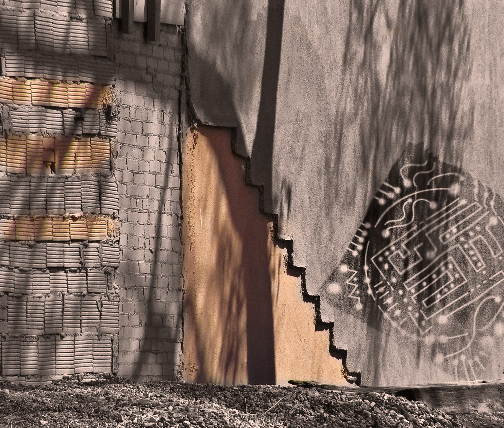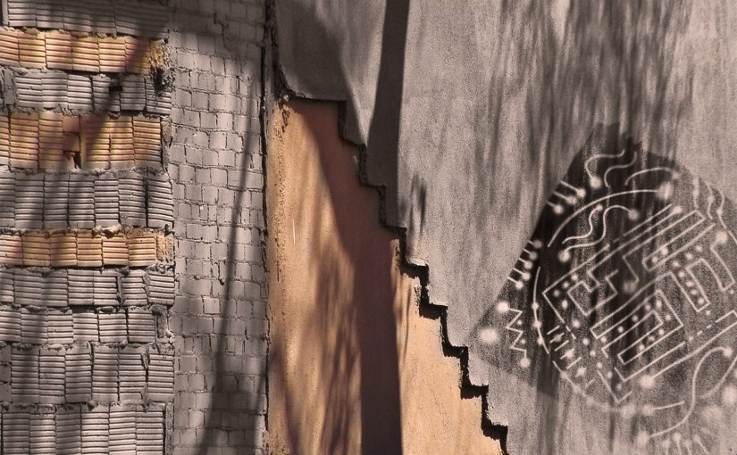 I often walk past this area because I like the textures, light and structure of these older dwellings. And look what I found here one time. It reminds me of a close-up of a micro chip or a transistor, or something like that. This is also another style that I’ve found before. I wish they would sign these. But I guess what would defeat the whole idea of “stealthy art”.