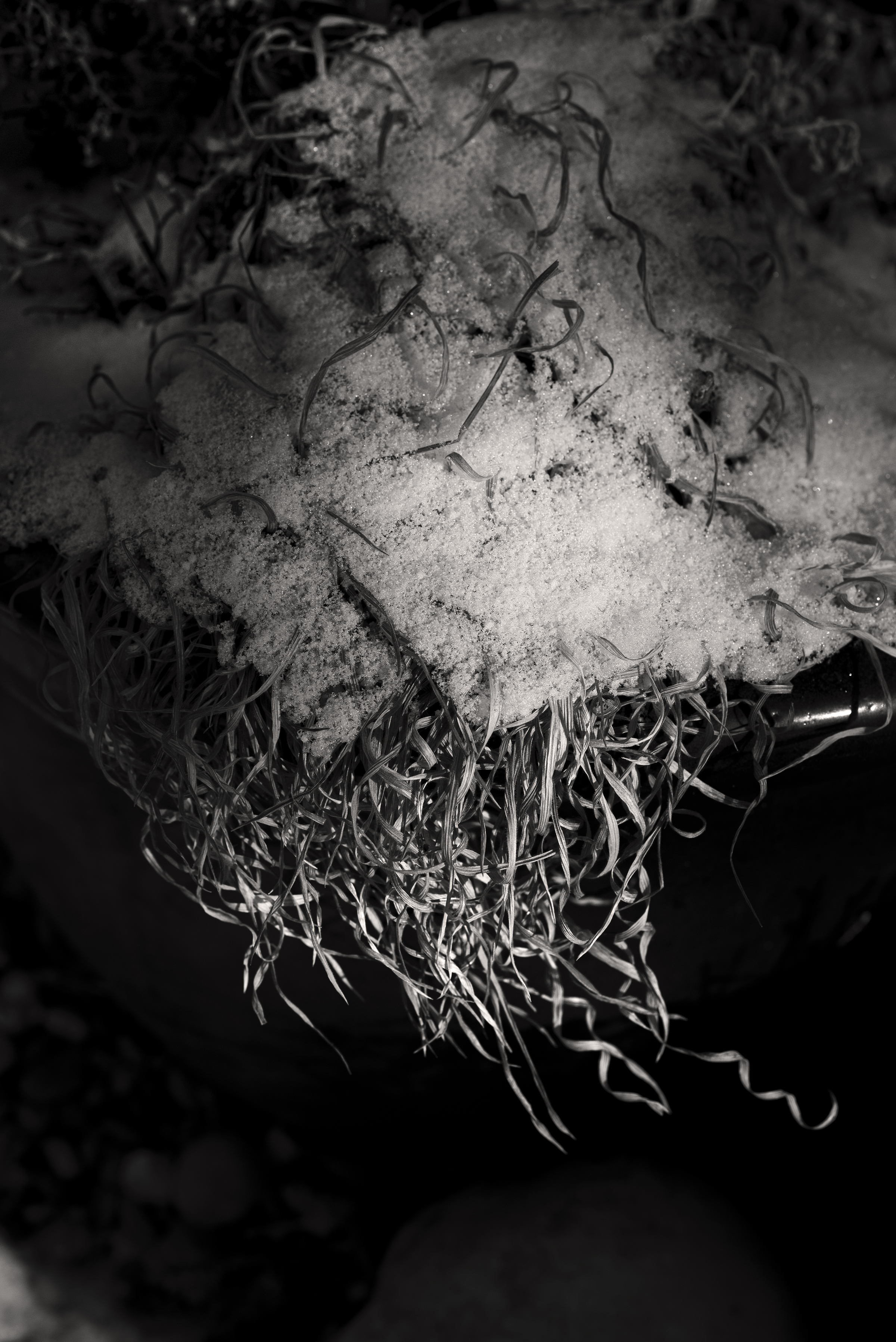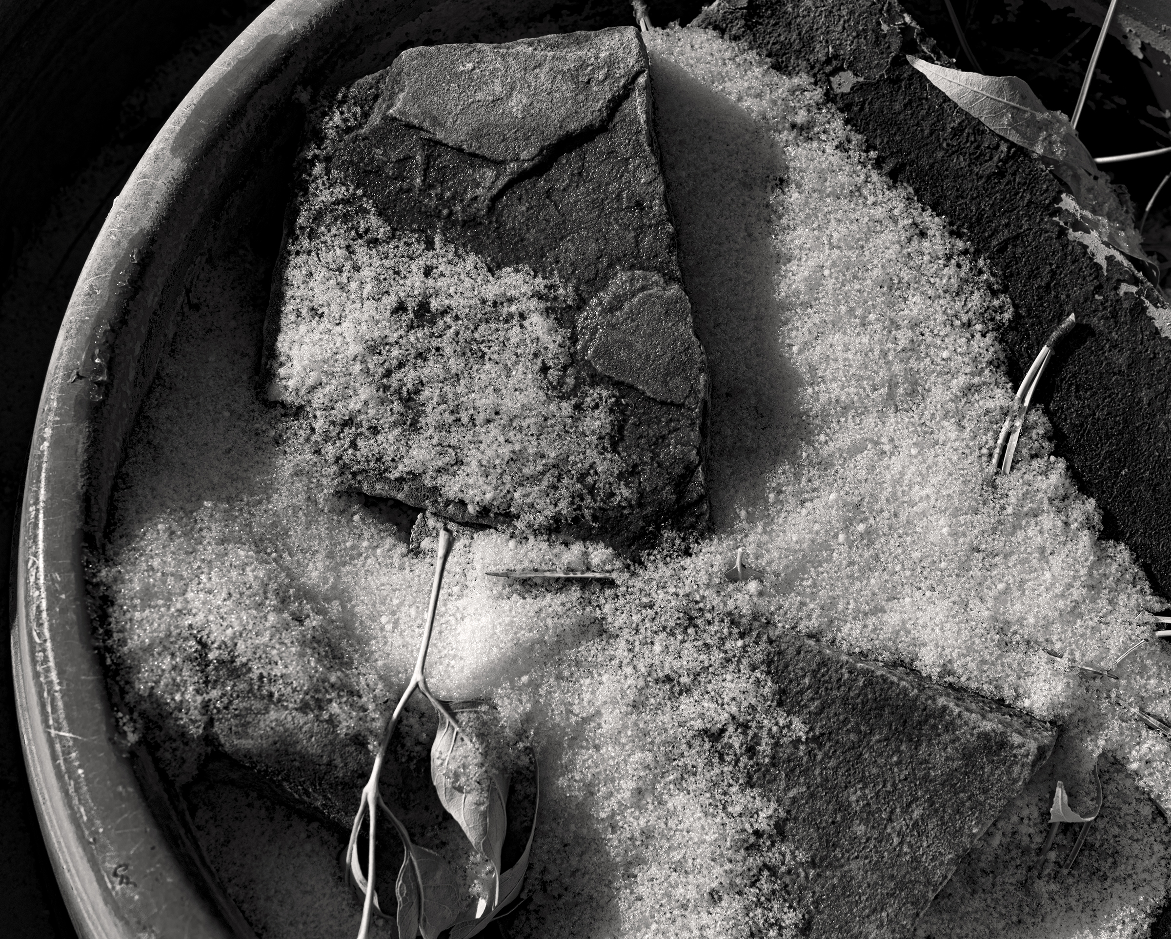Sometimes I say to myself, “Just step outside your own front door. Don’t go more than 20 meters in any direction, and see what’s there.” That is amazingly difficult. We had a nice blizzard the other day, but now it’s starting to melt. It was late afternoon when I went out, but it didn’t take long to become attracted to the strong light-play of pattern and design that was right under my feet.